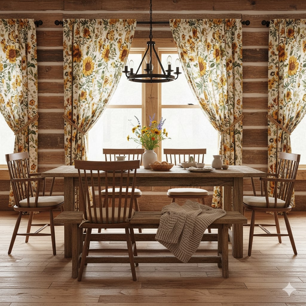 Floral or textured drapes in muted colors create a cozy, vintage feel.